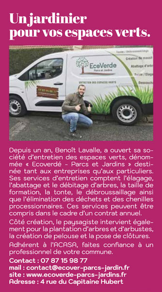 Nous avons eu le plaisir d’être mis à l’honneur dans le numéro de mars de L’Éclair, le magazine municipal de Saint-Arnoult-en-Yvelines. Ce bel encart présente notre entreprise EcoVerde – Parcs et Jardins, créée par Benoît Lavalle il y a un an, et résume notre mission : proposer des services d’entretien et d’aménagement paysager aussi bien aux particuliers qu’aux professionnels, avec passion et savoir-faire.